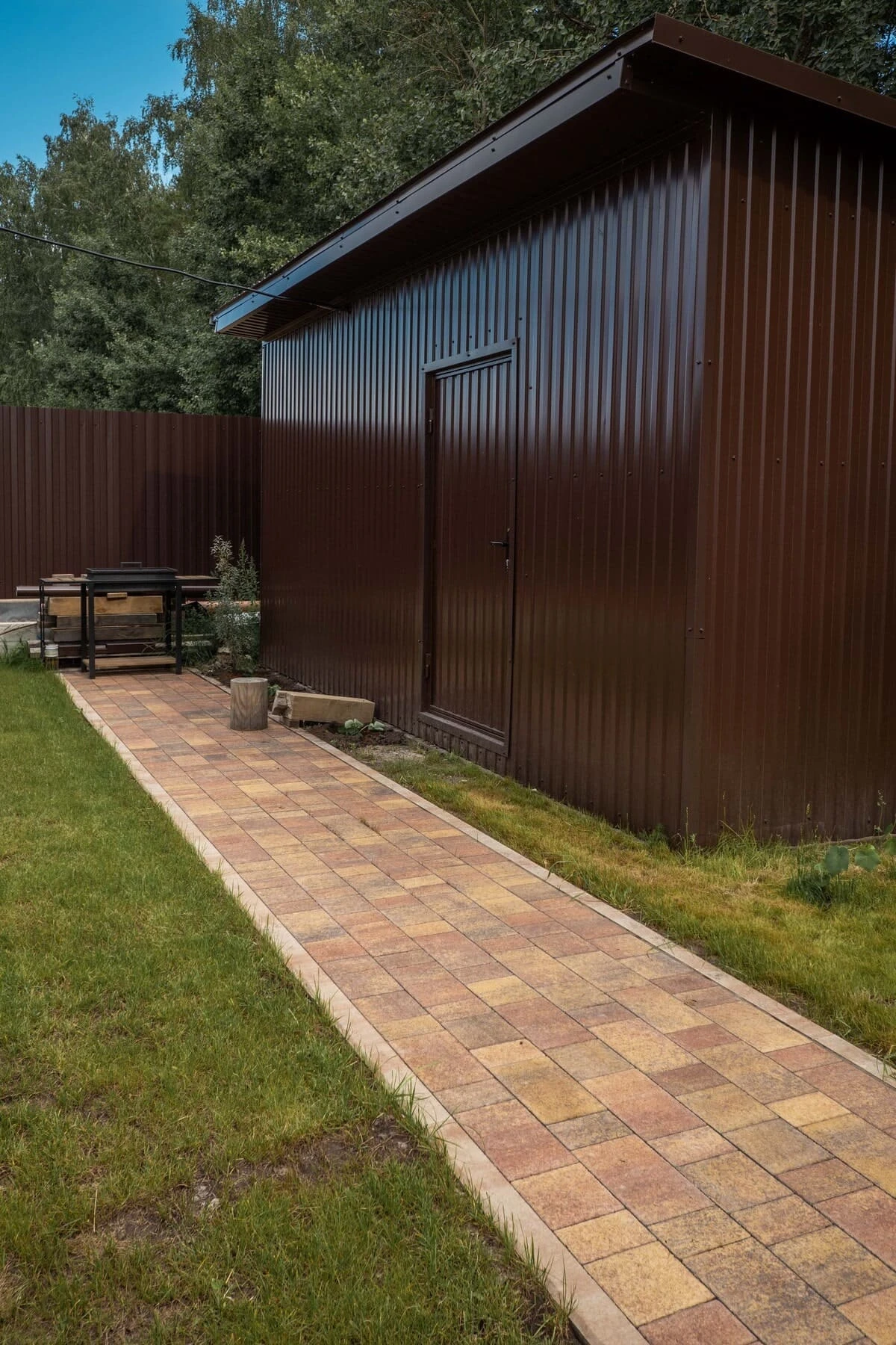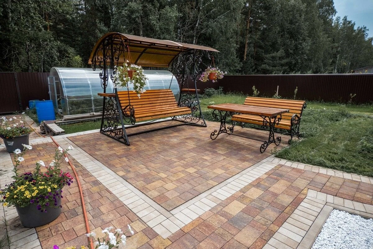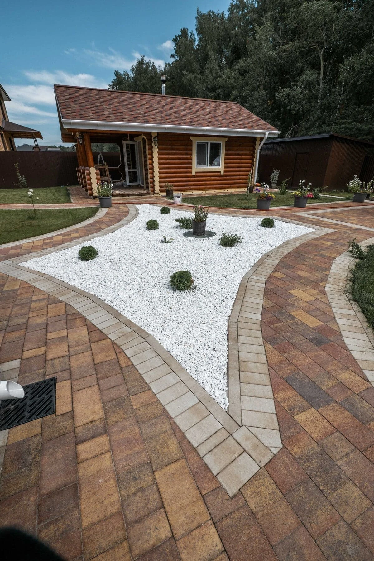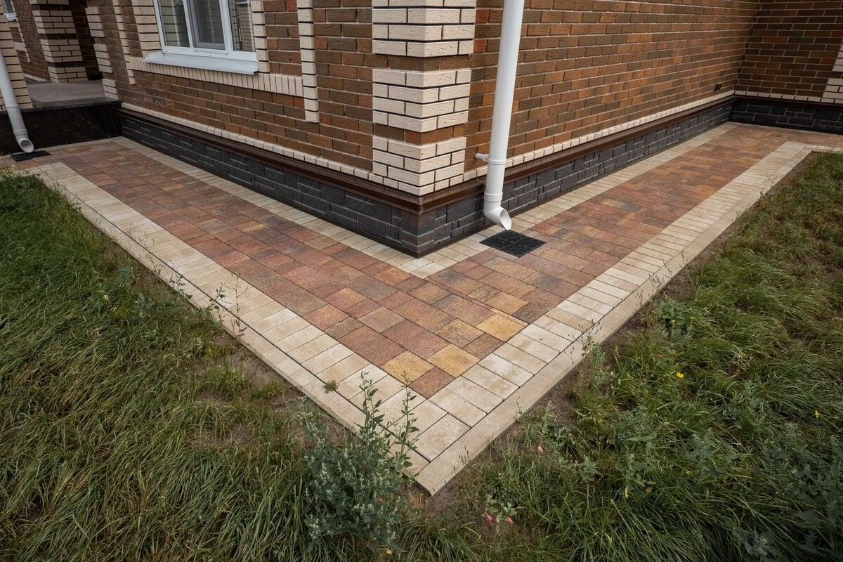 Мощение выполнено двумя тротуарными плитками от завода «Поревит»: «Старый город» в цвете Осень и «Прямоугольник» в цвете Степняк. Для оформления бордюров цвет «Степняк». Все товары представлены ниже и доступны для покупки.