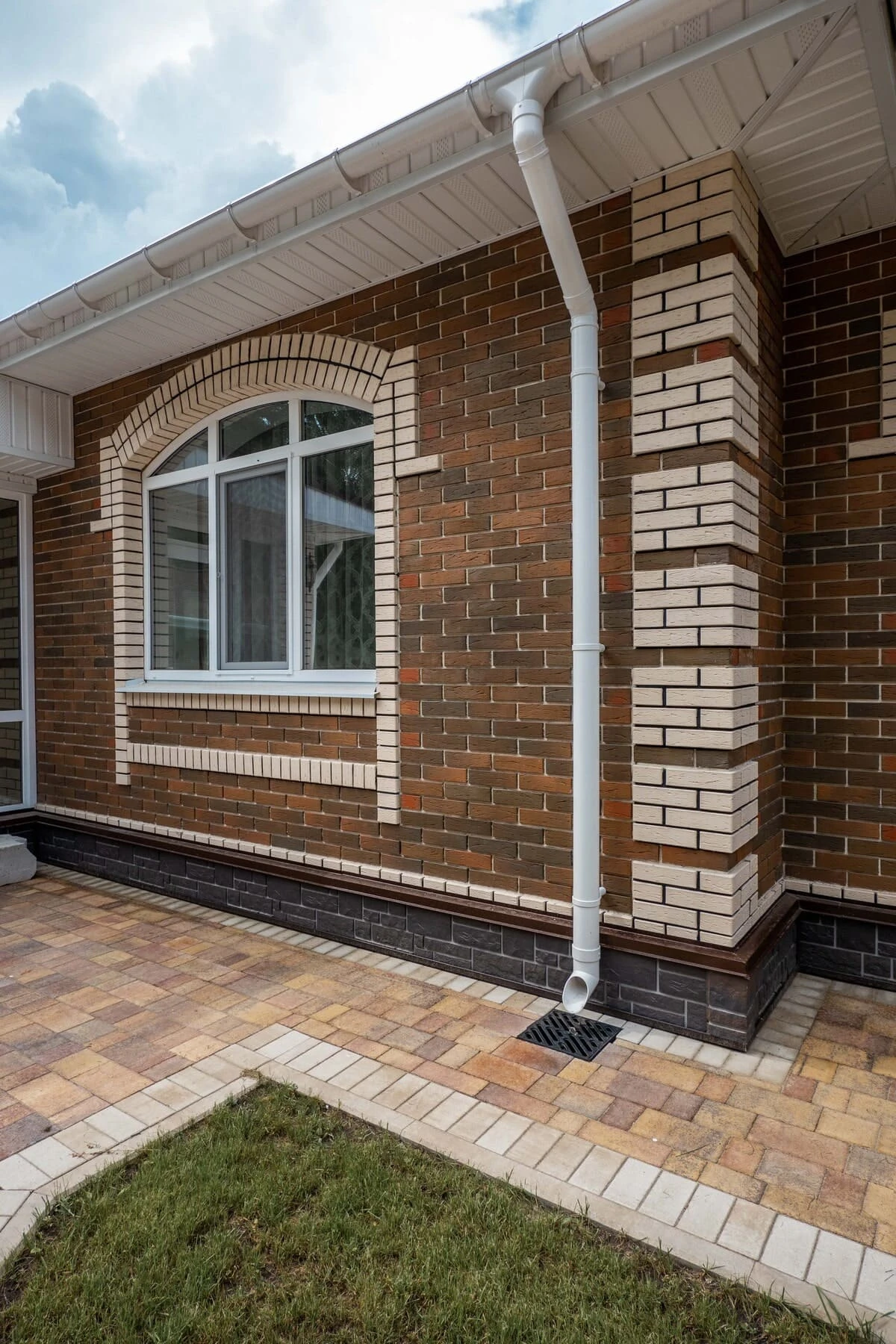 Классическое стилевое решение с сочетающимися между собой блоками позволило благоустроить территорию вокруг дома таким образом, чтобы не оттенять его дизайн, а дополнять архитектурные решения.