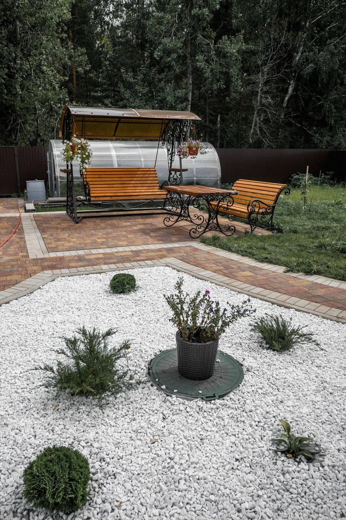Окантовка мощения выполнена плиткой прямоугольник светло-песчаного цвета Степняк. Выполнено подземное водоотведение с помощью дренажных труб. Прямо на брусчатке установлены скамейки и мангал. Некоторые зоны засыпаны декоративным белым камнем (гравием), там организована посадка растений, часть брусчатки находится под крытым навесом.