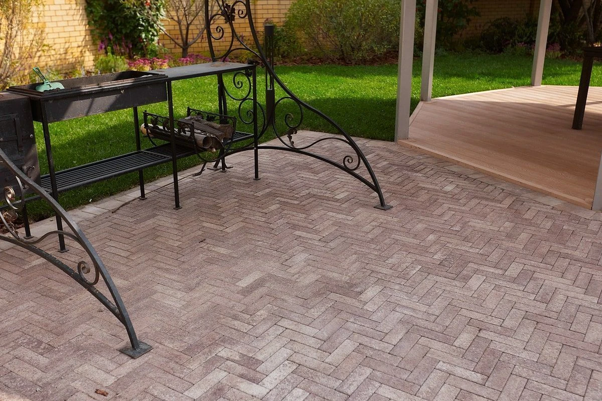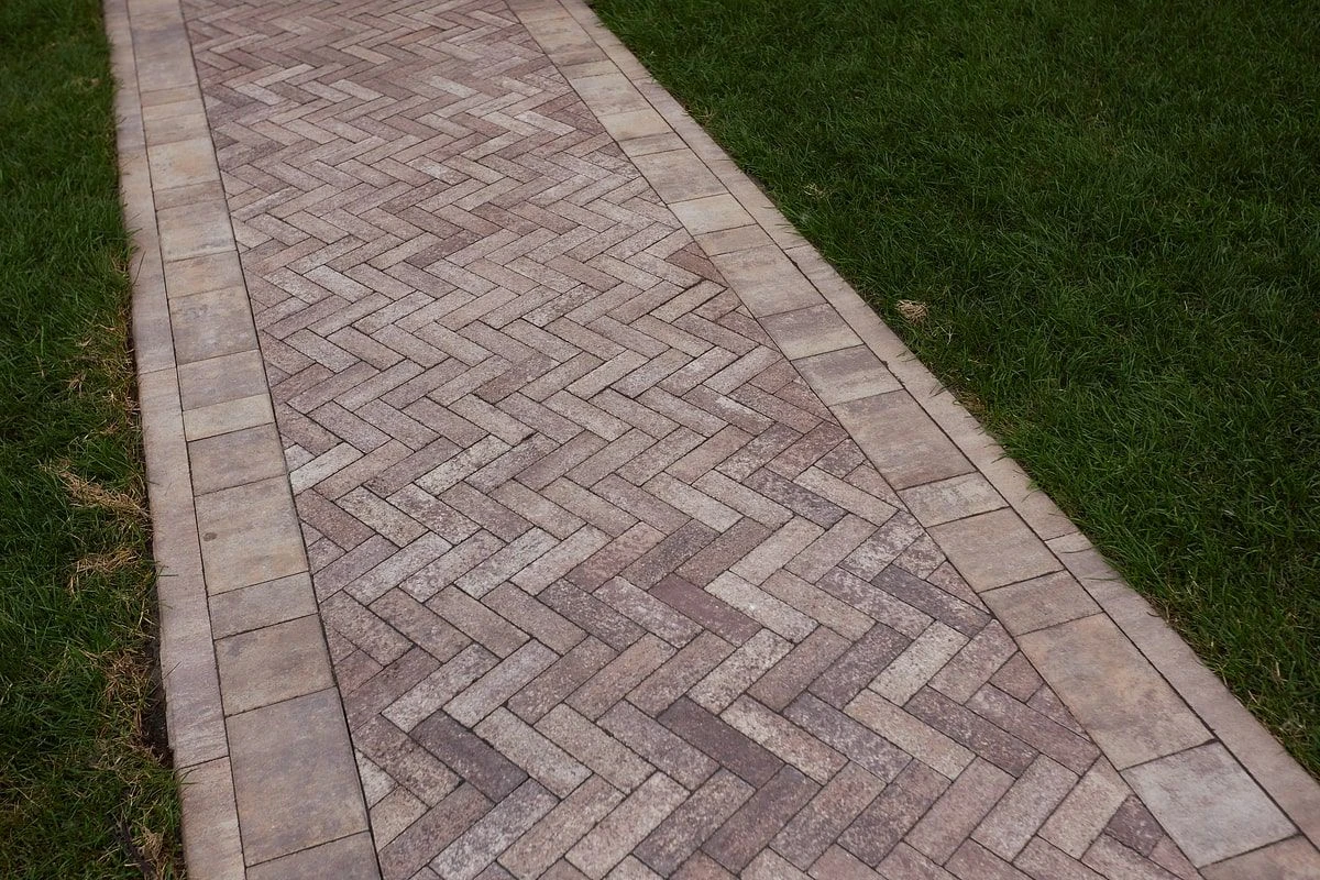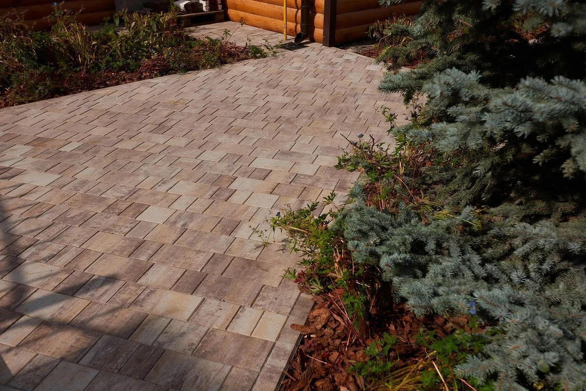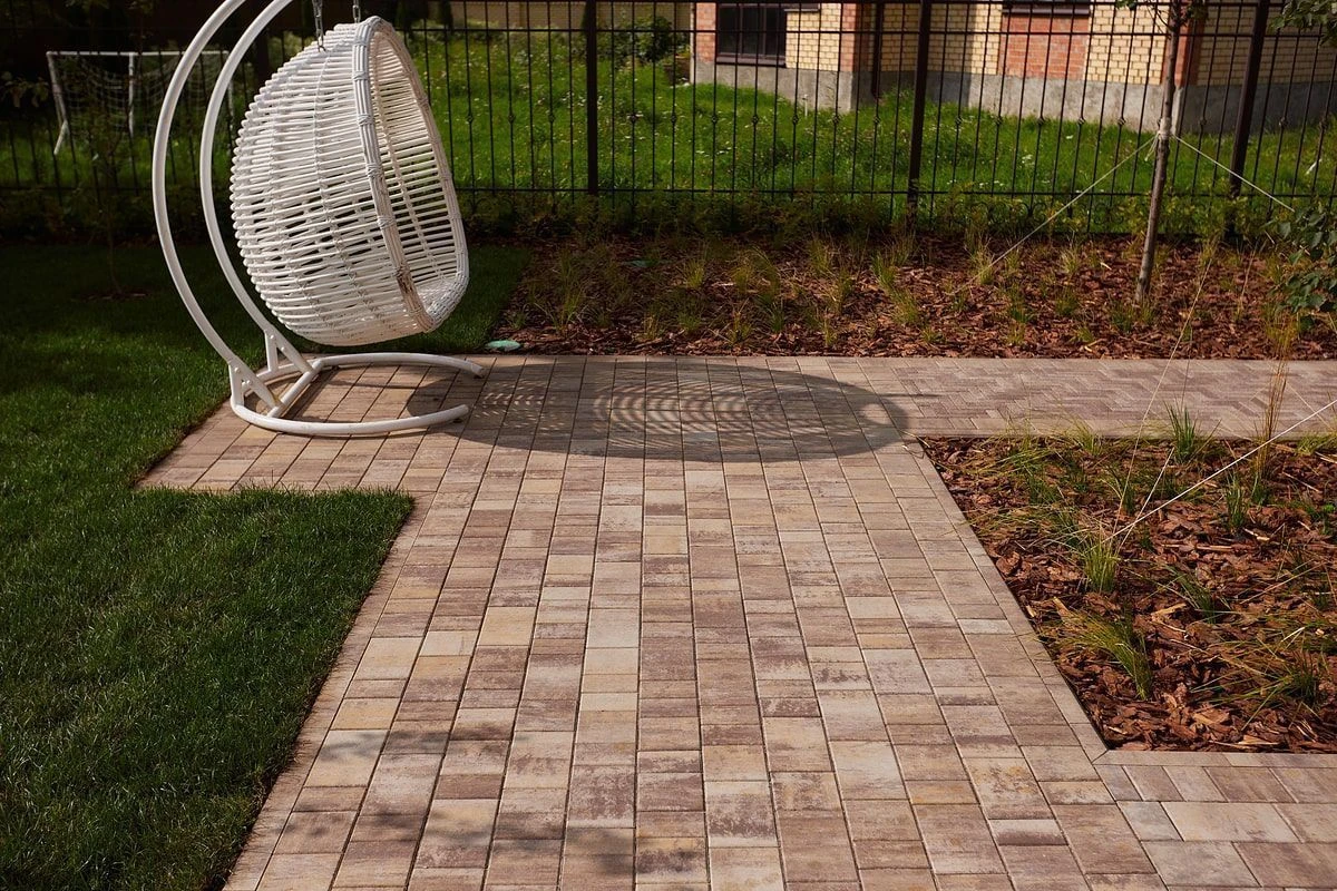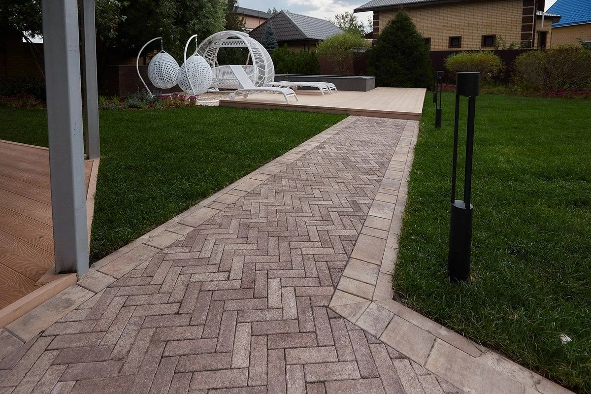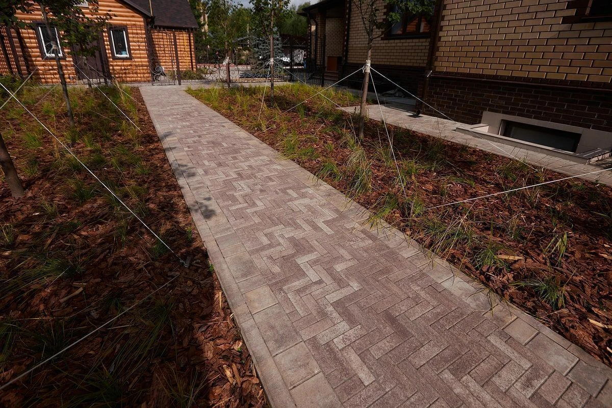 Ландшафтный дизайн участка с укладкой плитки Старый город и Паркет 180х60 в Тюмени.