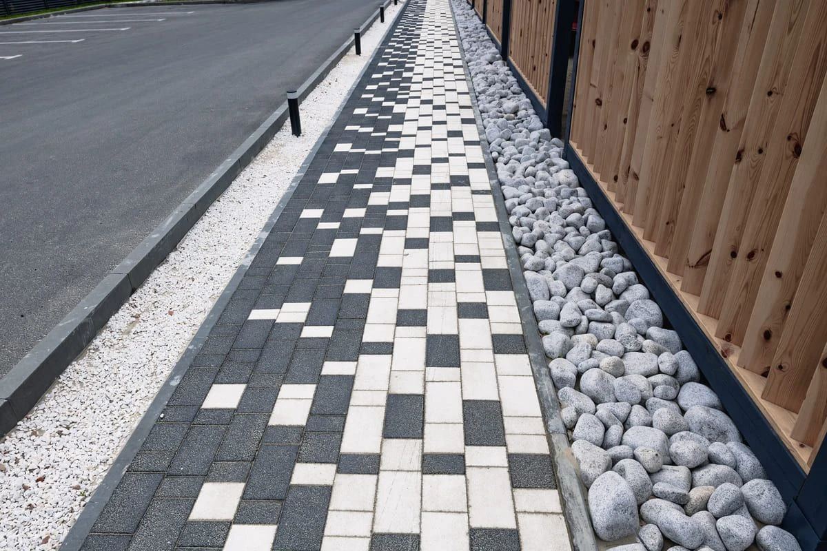 Основной рисунок выстроен с помощью хаотичной разбивки черного и белого цвета, но в местах ближе к дороге или дому плитка переходит в один цвет — черный или белый. Это визуально отделяет прогулочную зону от всех остальных, при этом подобранные цвета гармонируют с постройкой.
