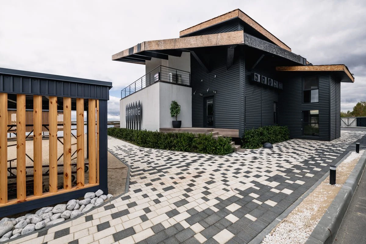 Благоустройство базы отдыха Липовое выполнено с применением плитки «Поревит». Основой тротуарного мощения стала плитка Старый город в коллекции Мрамор белого и черного цвета. Фактура плитки придает ей премиальность, блеск на солнце.