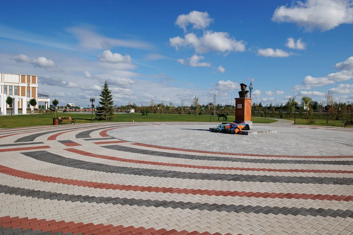 Зона фонтана и территория, где расположен памятник Маршалу И.Х. Баграмяну  оформлены плиткой Старый город и прямоугольник 100 на 200 в цвете Антрацит.
