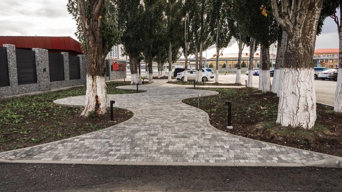 Пешеходная зона с извилистыми дорожками стала современным местом для отдыха посетителей и сотрудников ТЦ. Также выполнены работы по установке светильников вдоль дорожек.