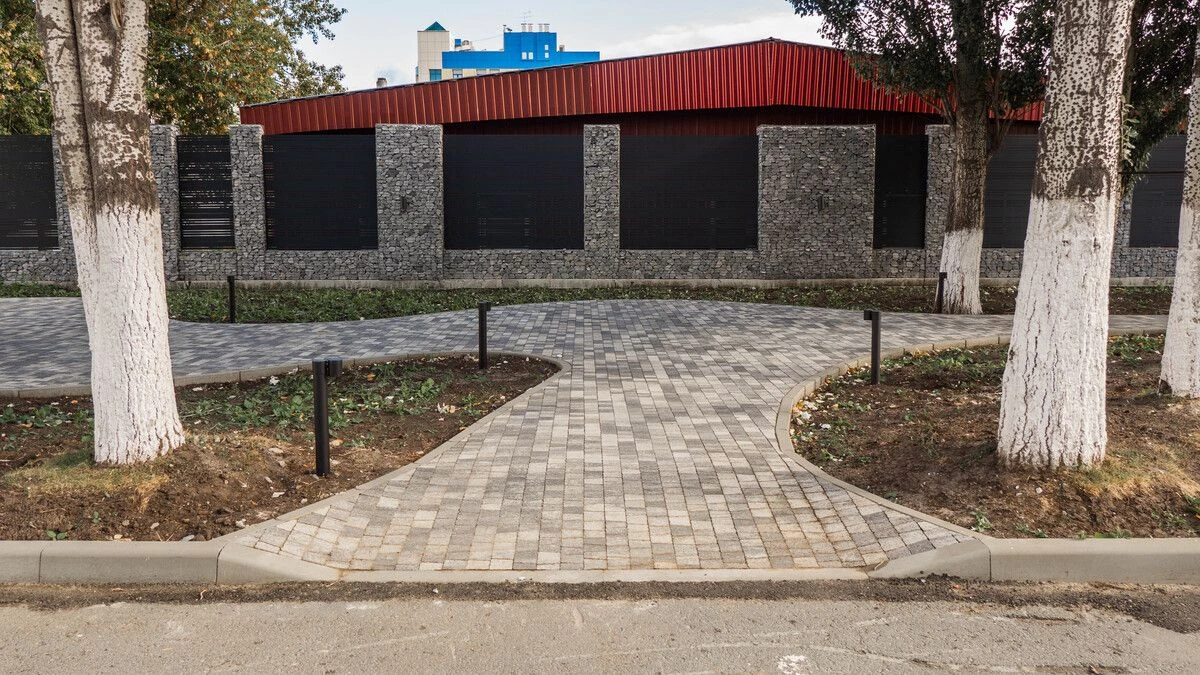 Территория рядом с парковочной зоной у ТЦ Новый Магнат относится к городским проектам. Учитывая особенности инфраструктуры, текущей архитектуры и общего стиля, подобранная тротуарная плитка стала отличным дополнением к проекту. Особенно хорошо сочетается она с габионами (заборы из металлической сетки, заполненные щебнем). Деревья создают дополнительную тень для отдыха, защищая от солнца.