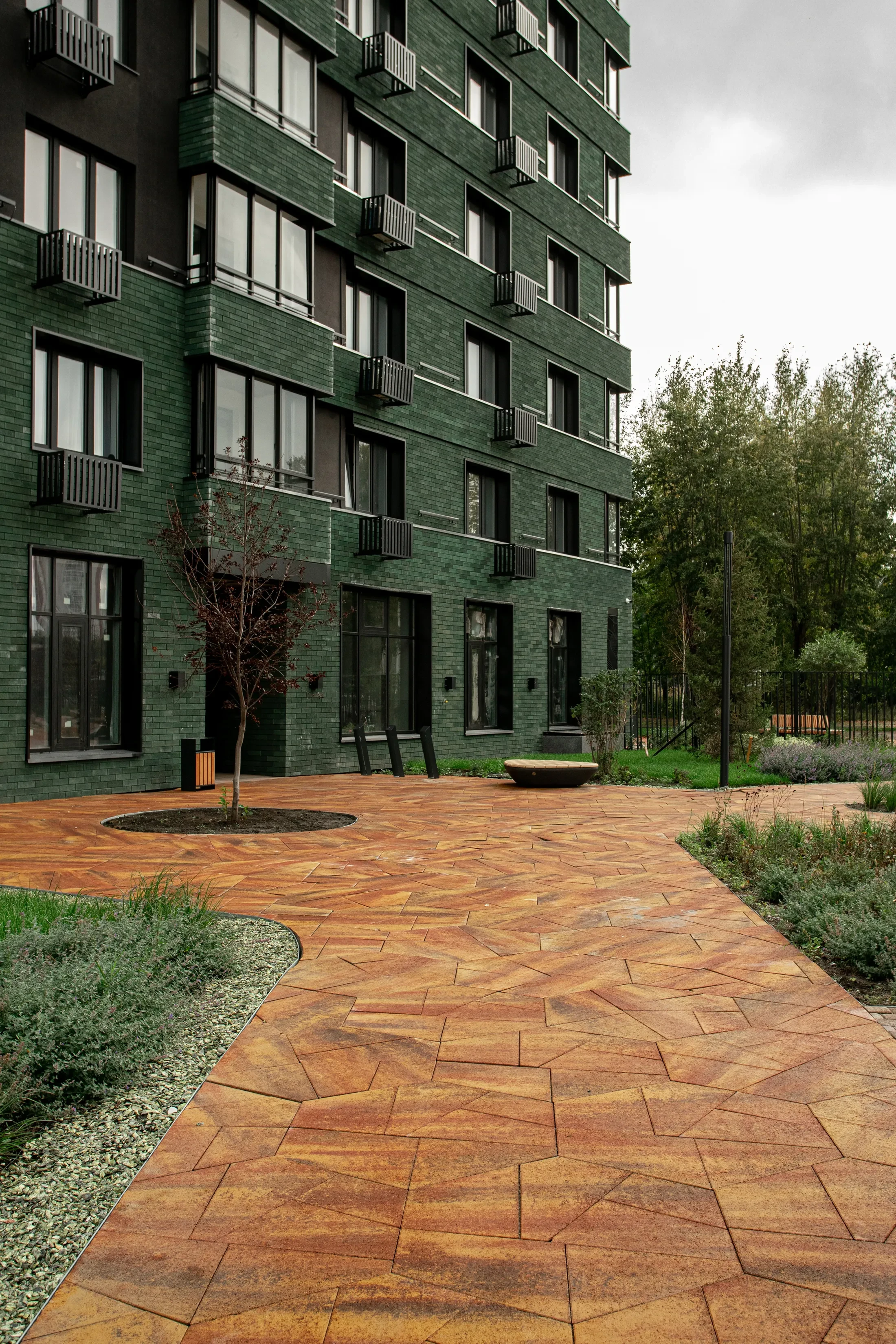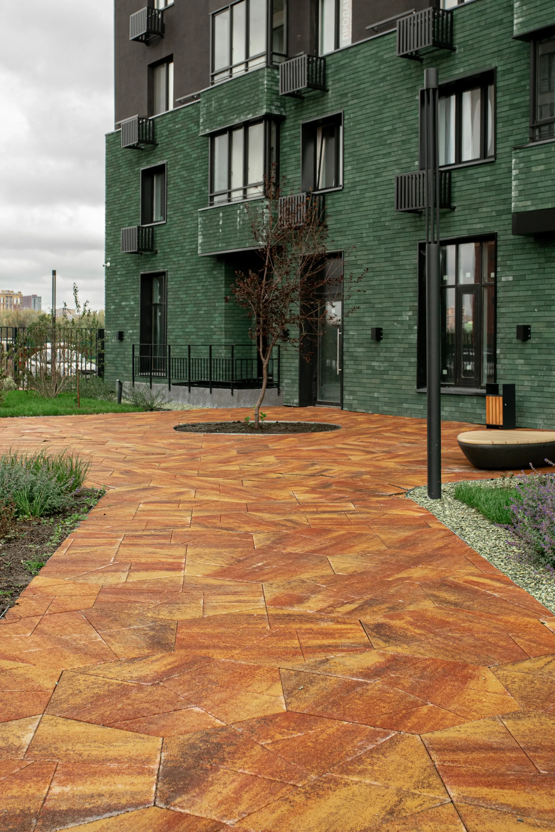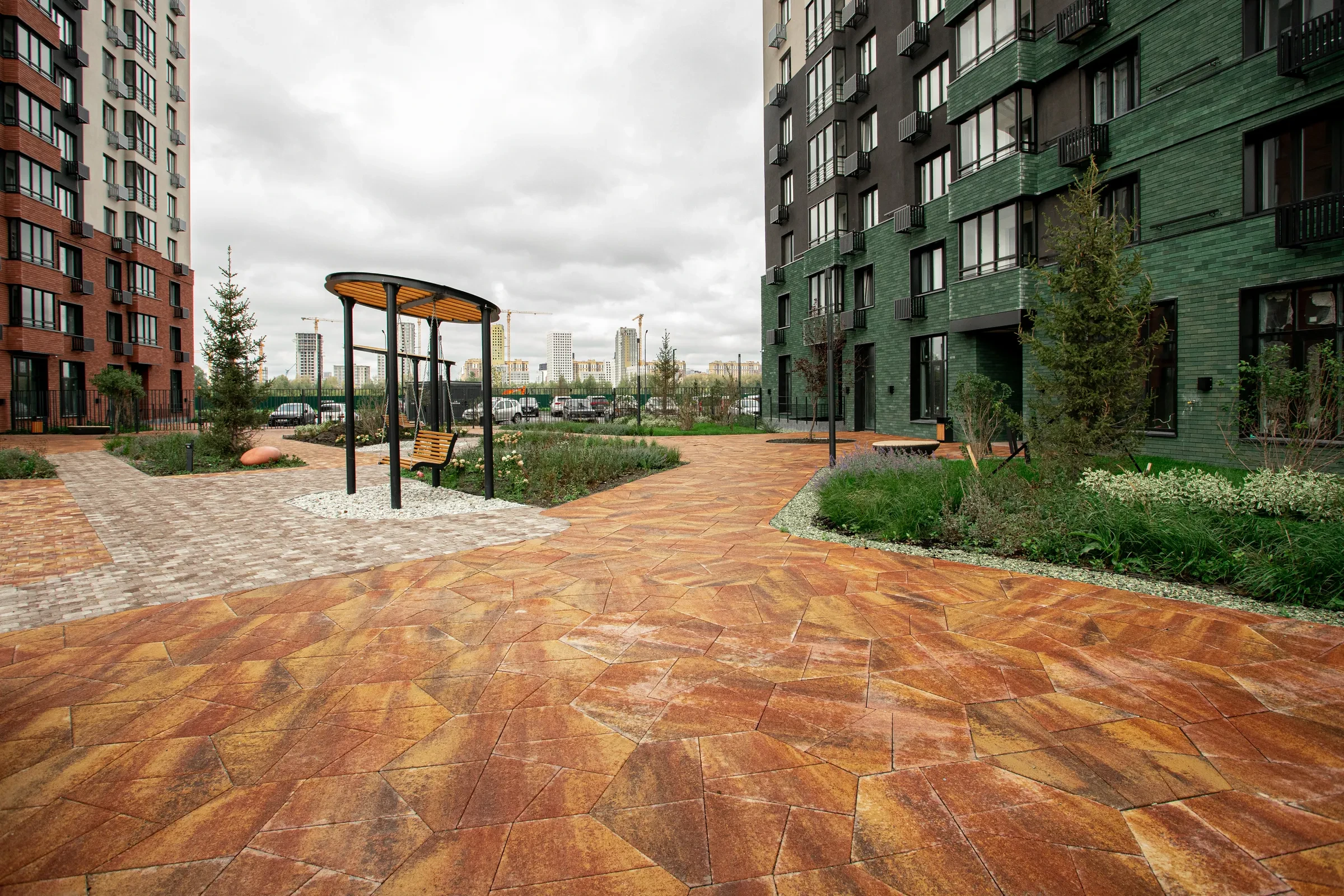 Территория жилого комплекса "О Два" в Тюмени благоустроена с применением твердых покрытий из тротуарной плитки в толщине 60 и 80 мм.