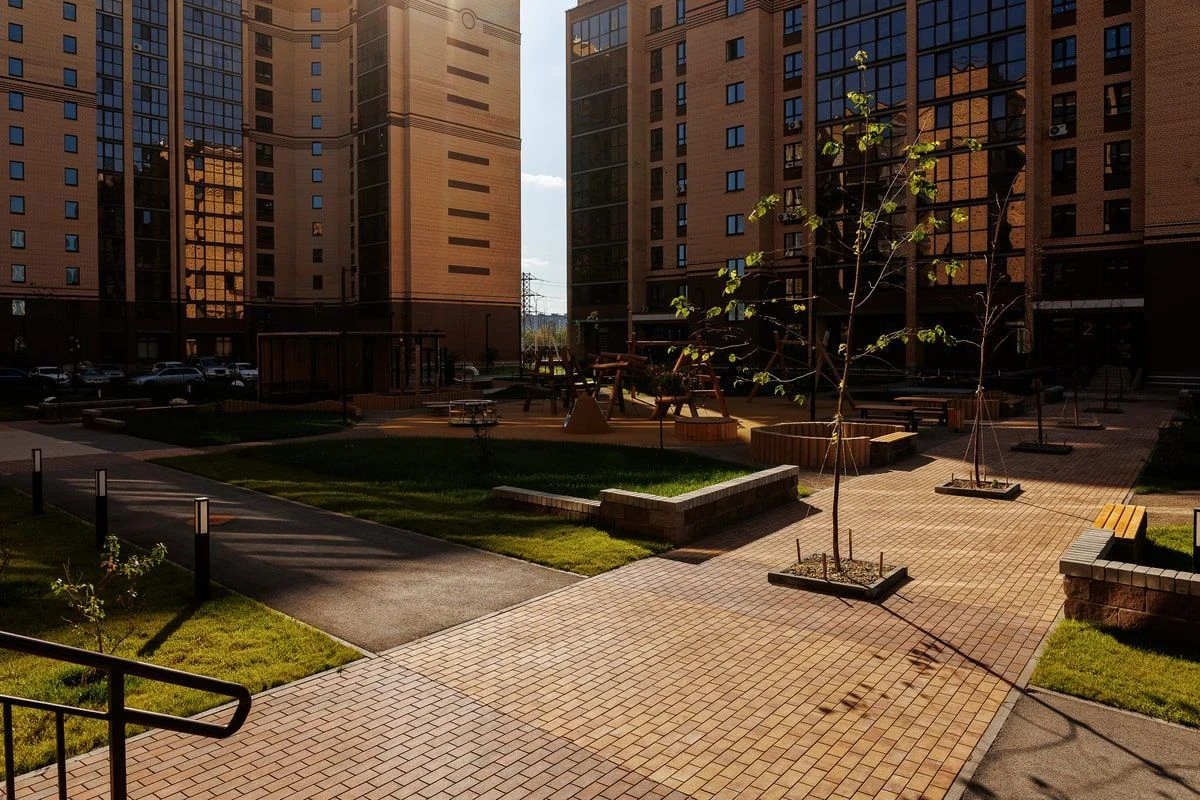 Визуально области не отделяют разные части двора, однако добавляют эффект разнообразия в дополнение к выполненным работам по благоустройству площадки. На проекте используется тротуарная плитка «Поревит» в цветах Белый, Черный, Каир и Клинкер.
