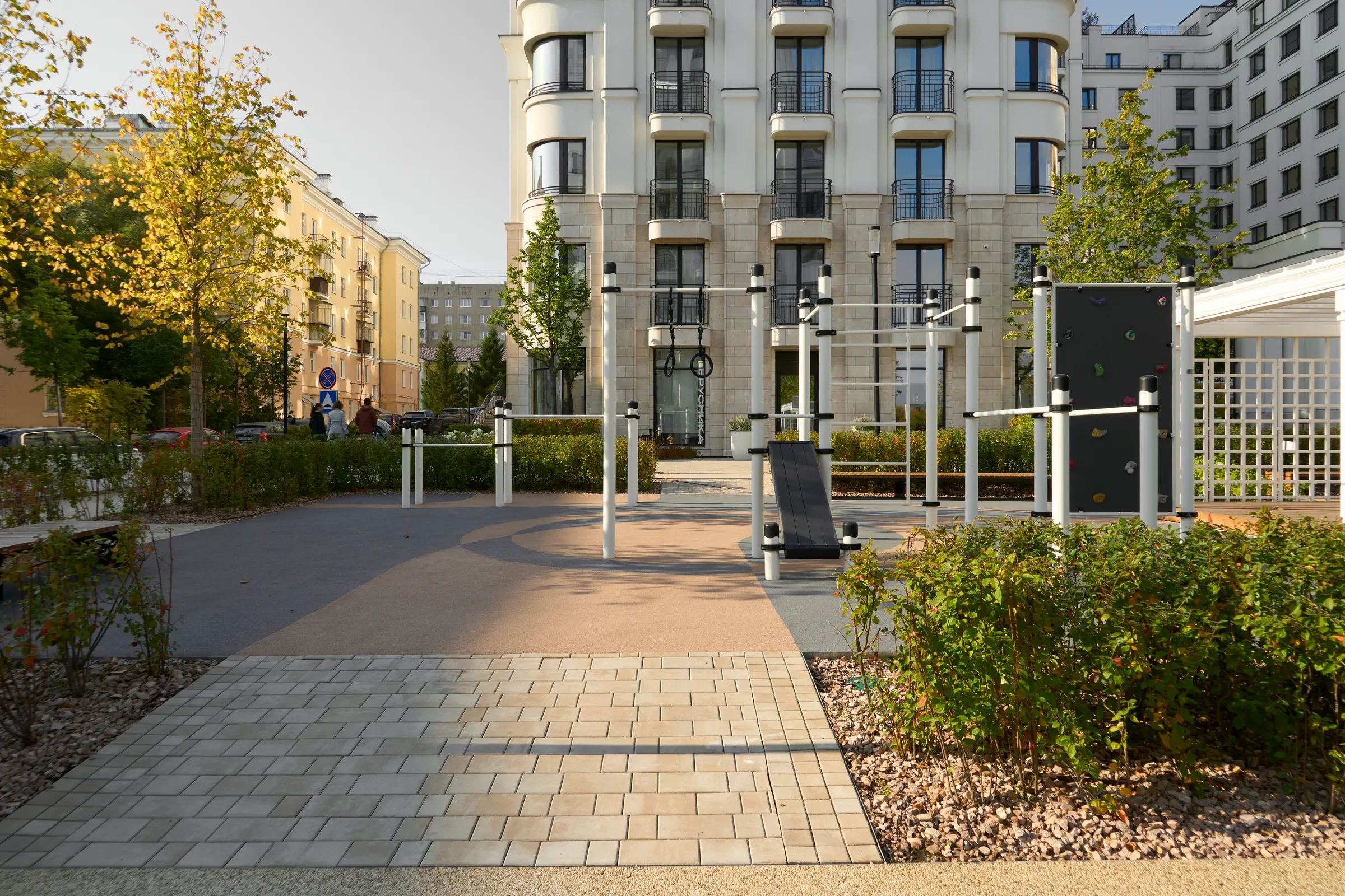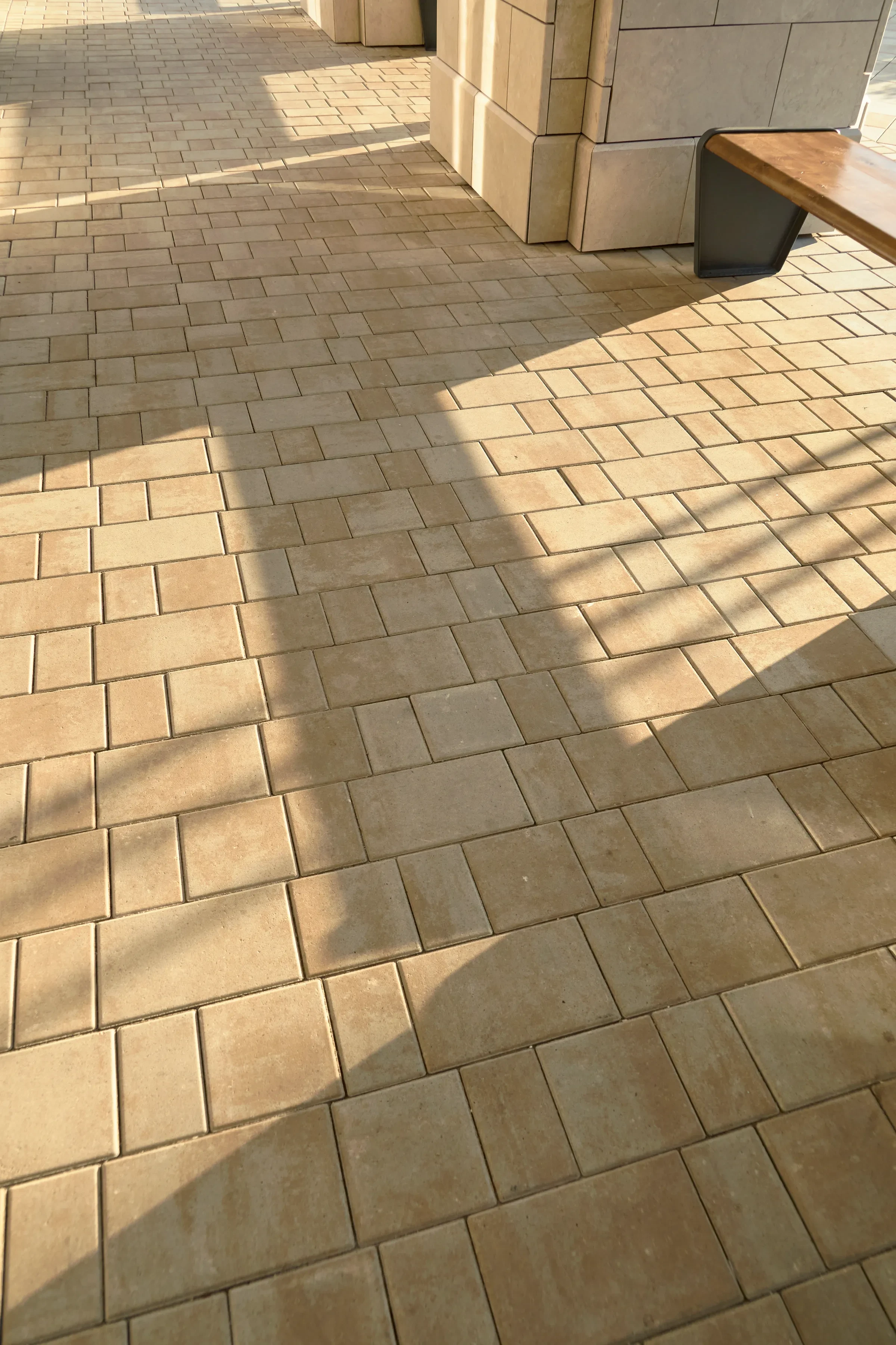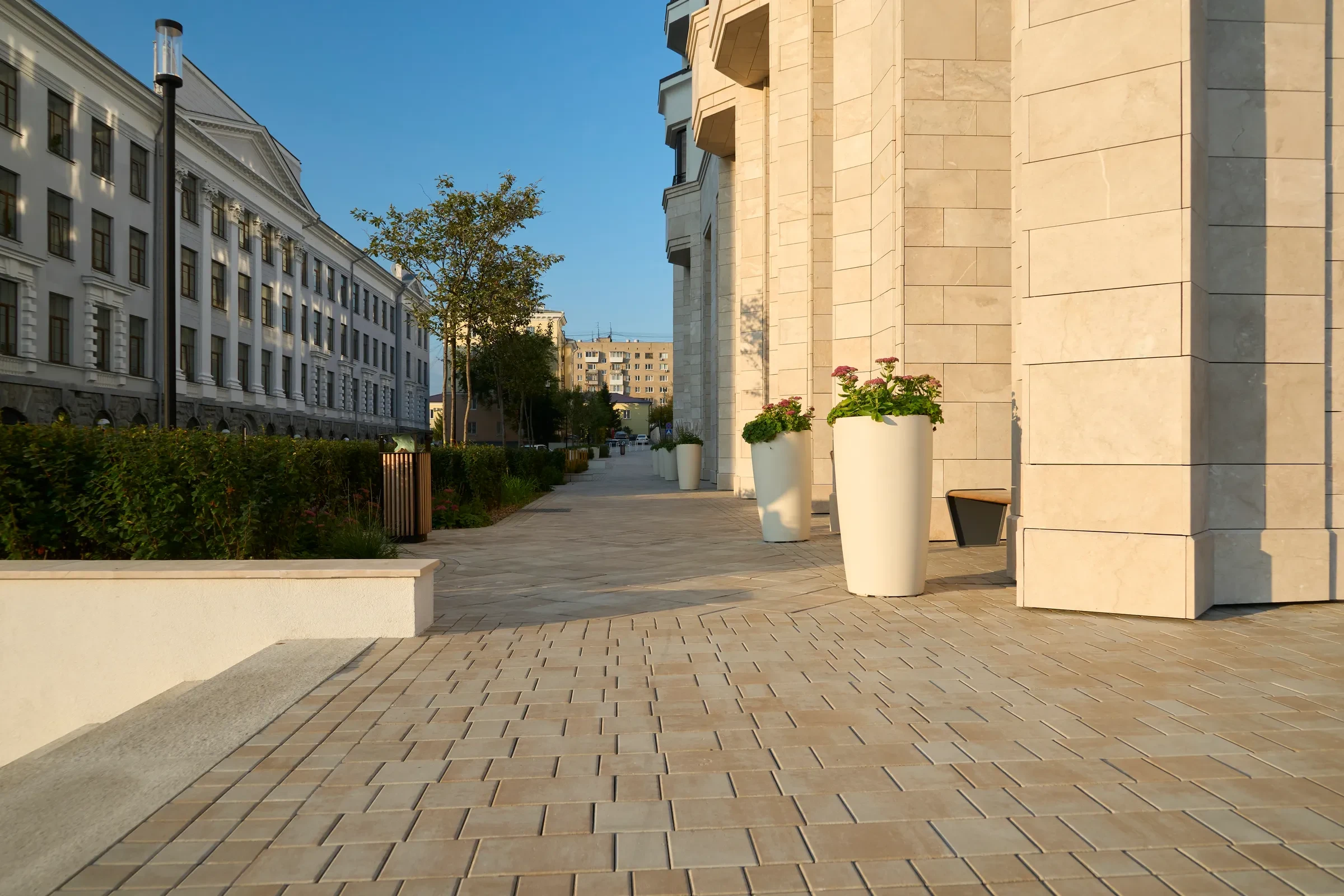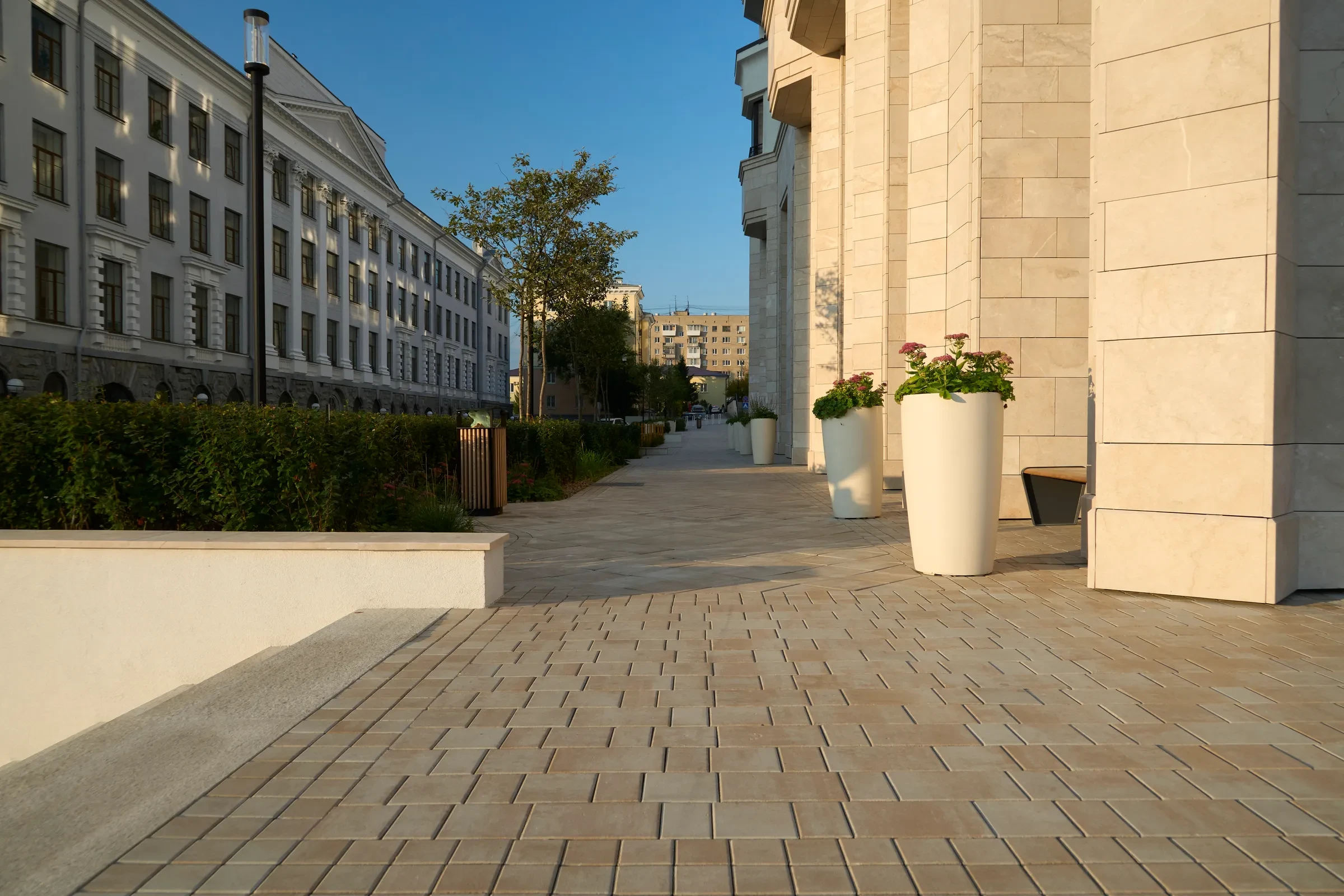 Песчаный цвет плиты идеально сочетается с фасадами домов.