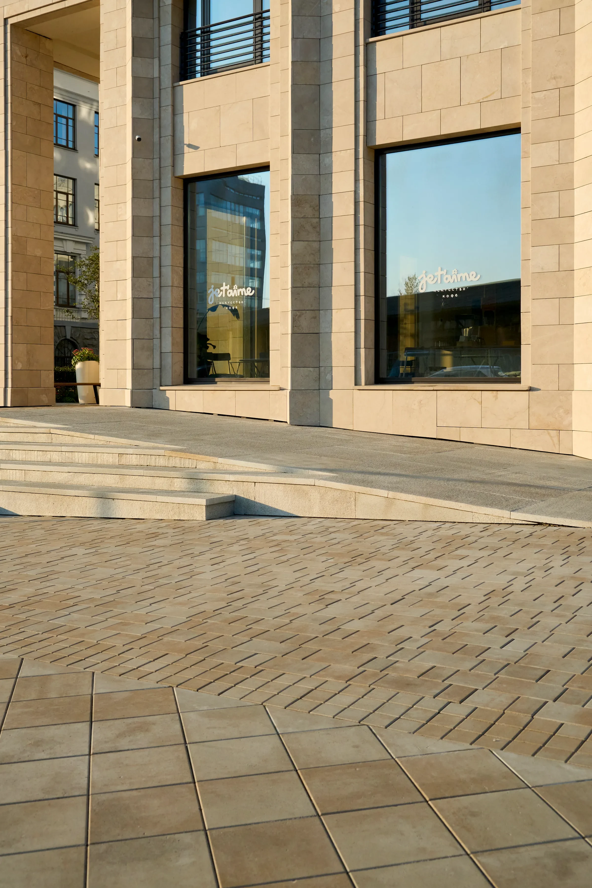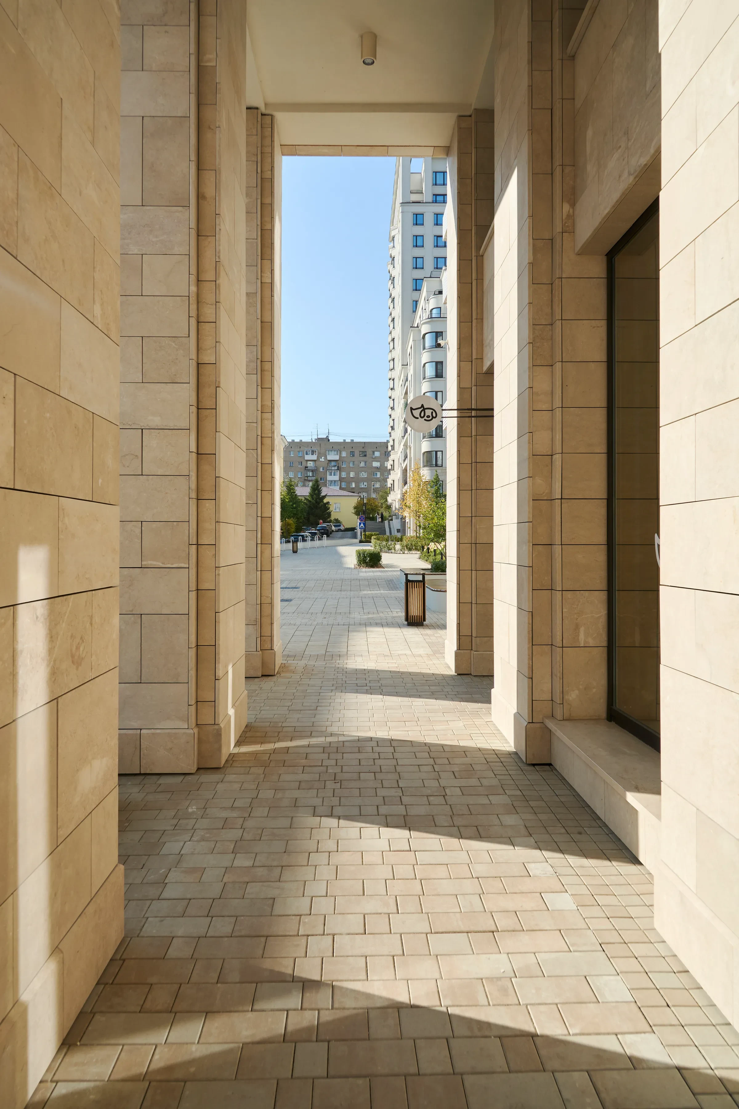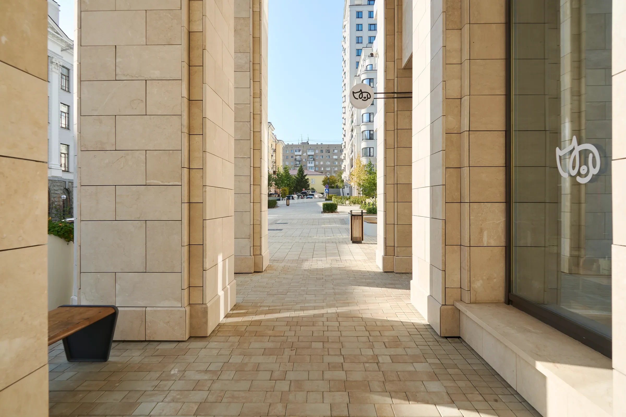Песчаный цвет плиты идеально сочетается с фасадами домов.