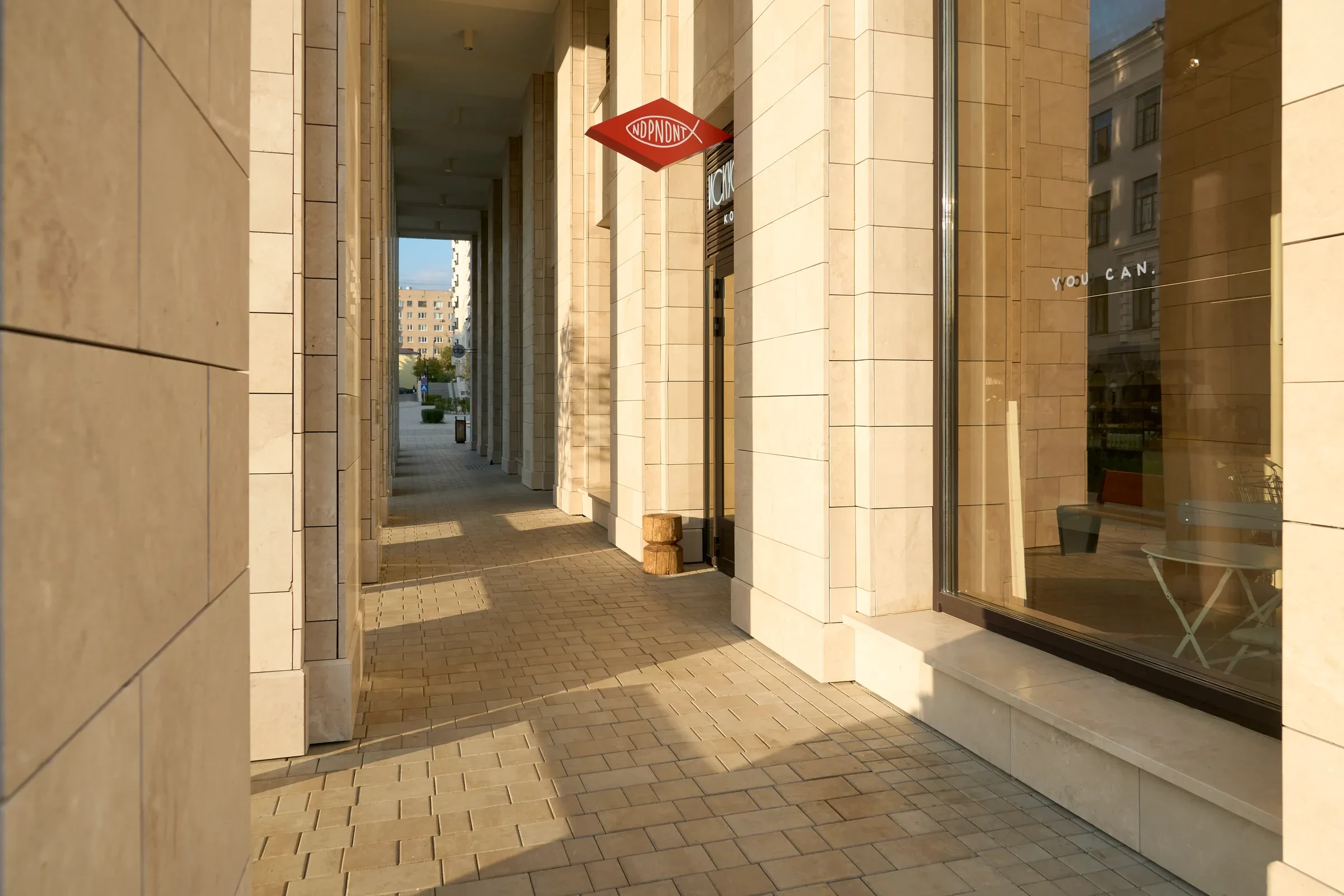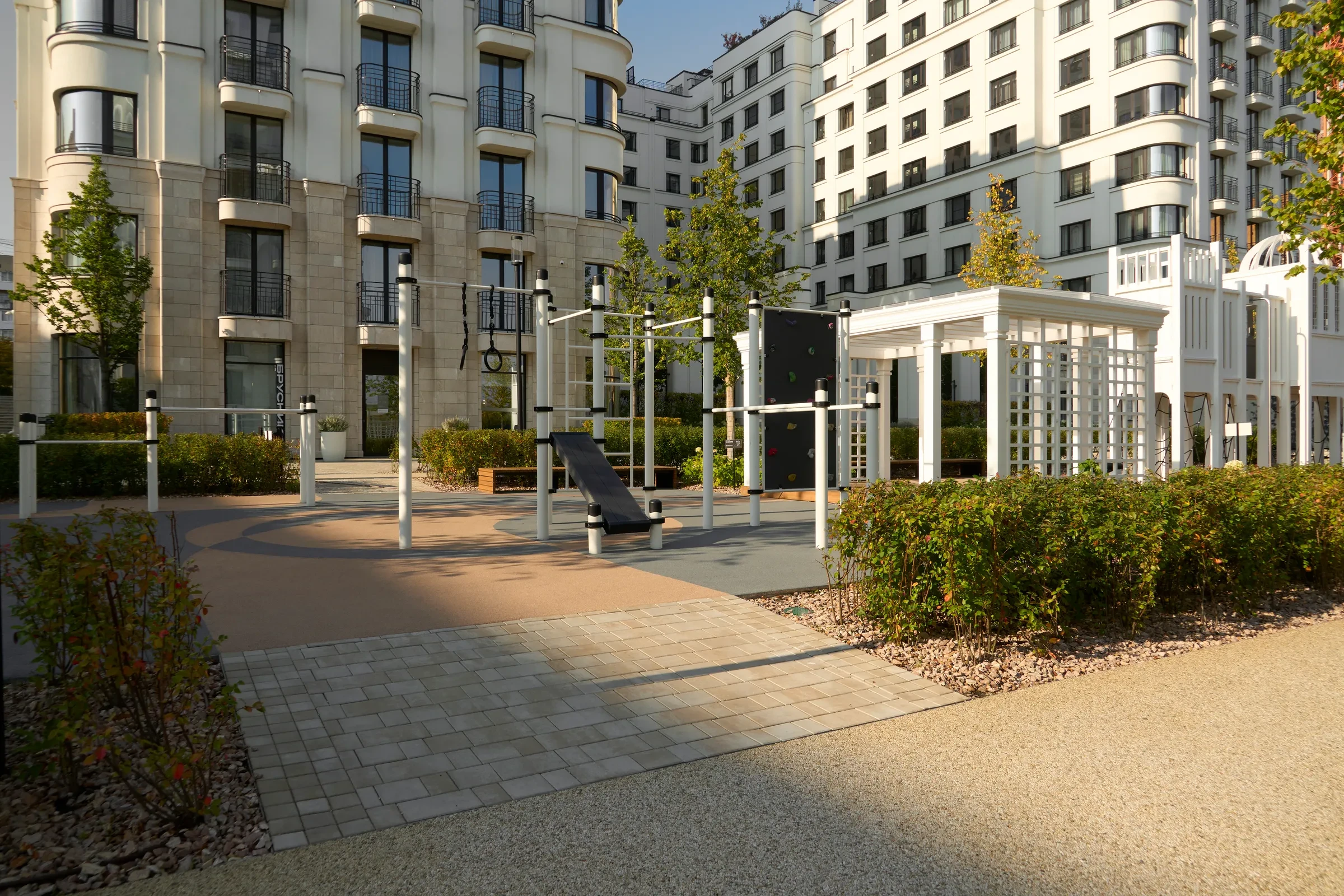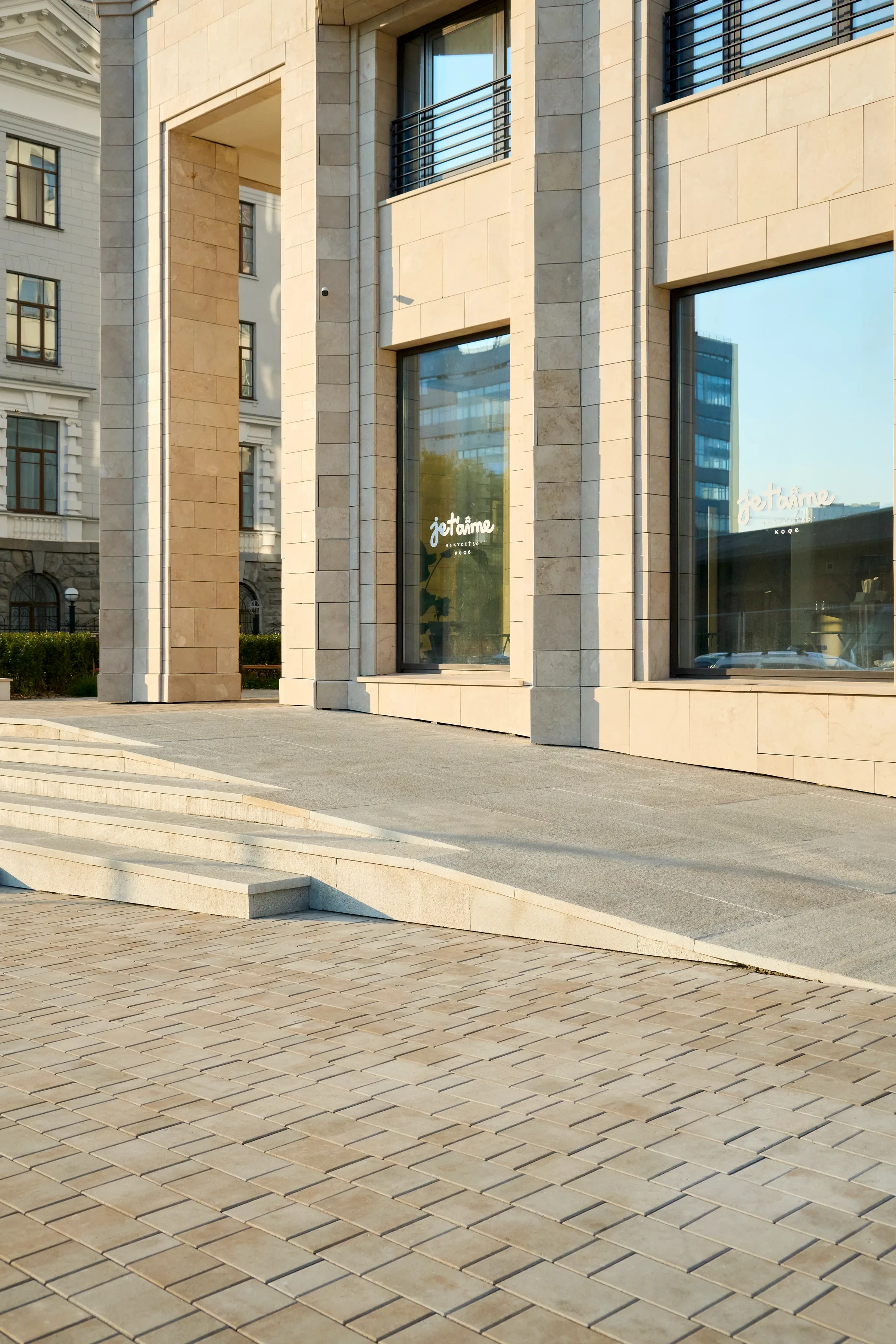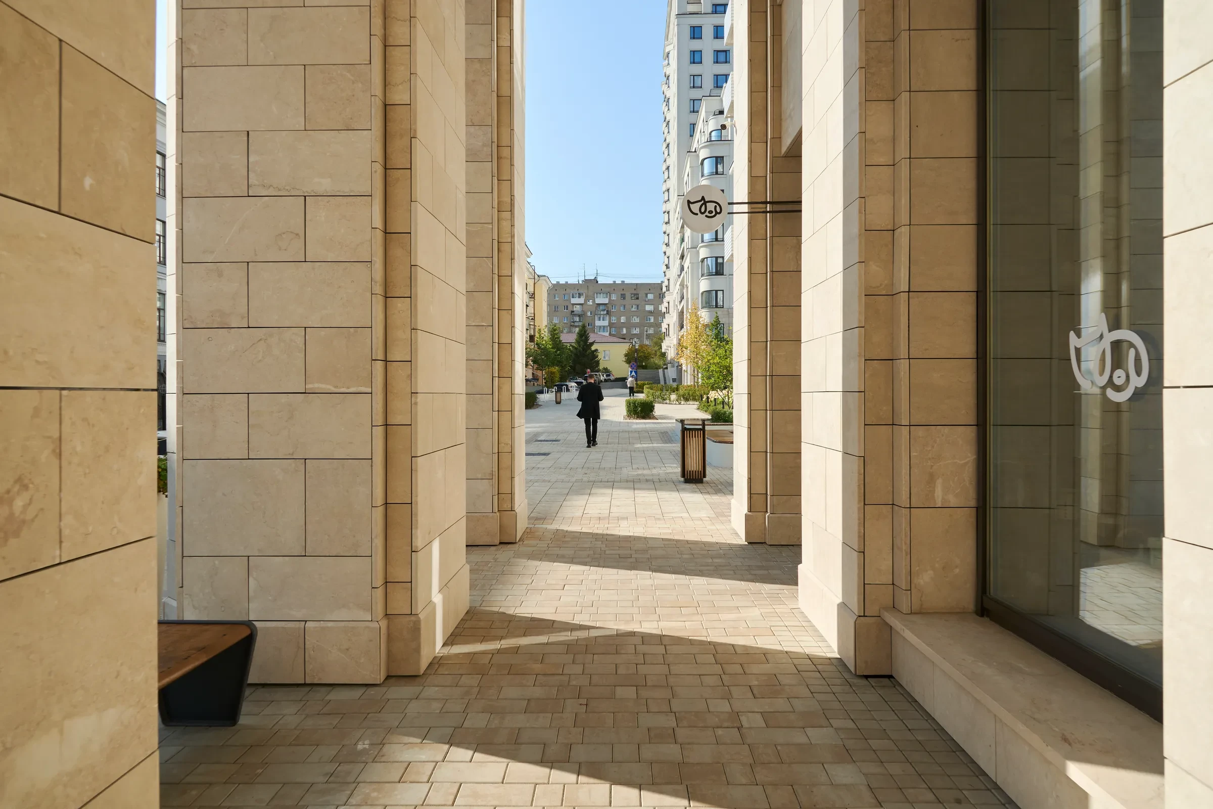 Песчаный цвет плиты идеально сочетается с фасадами домов.