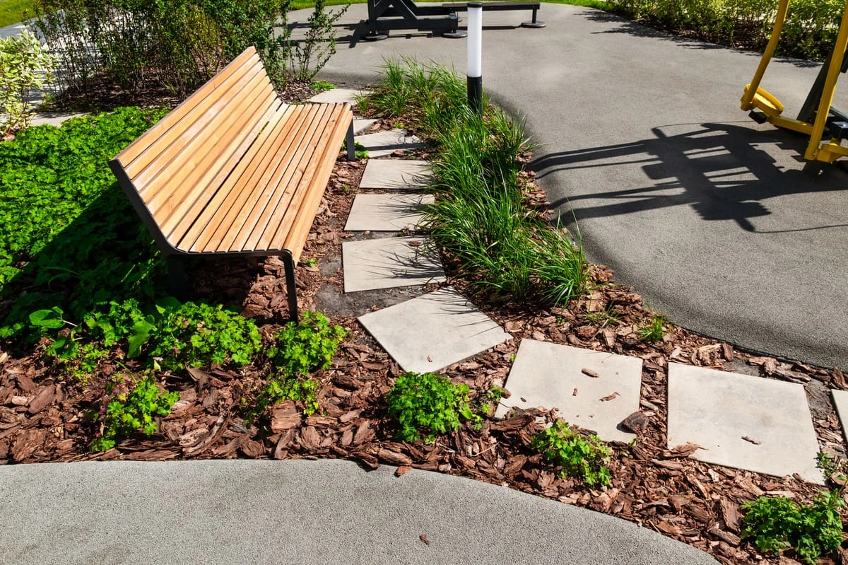 Для создания дополнительного эффекта жизни рядом с природой дизайнеры дополнили вариант небольшими шаговыми дорожками прямо посреди травы — они выполнены плиткой «Квадрат» белого цвета и имеют зазоры между собой. Те засыпаны мульчой — древесной корой. Благодаря таким дорожкам настроены короткие пути к отдельным элементам во дворе с большим сохранением озеленения. При укладке брусчатки использованы как бетонные бордюры, так и стальные.
